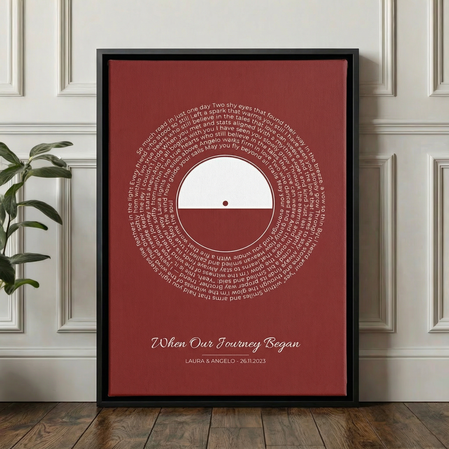 This design is clean, calming, and Scandinavian in feel, making it ideal for modern interiors. It works beautifully as an anniversary gift, a wedding keepsake, or a meaningful way to display the story behind your song.